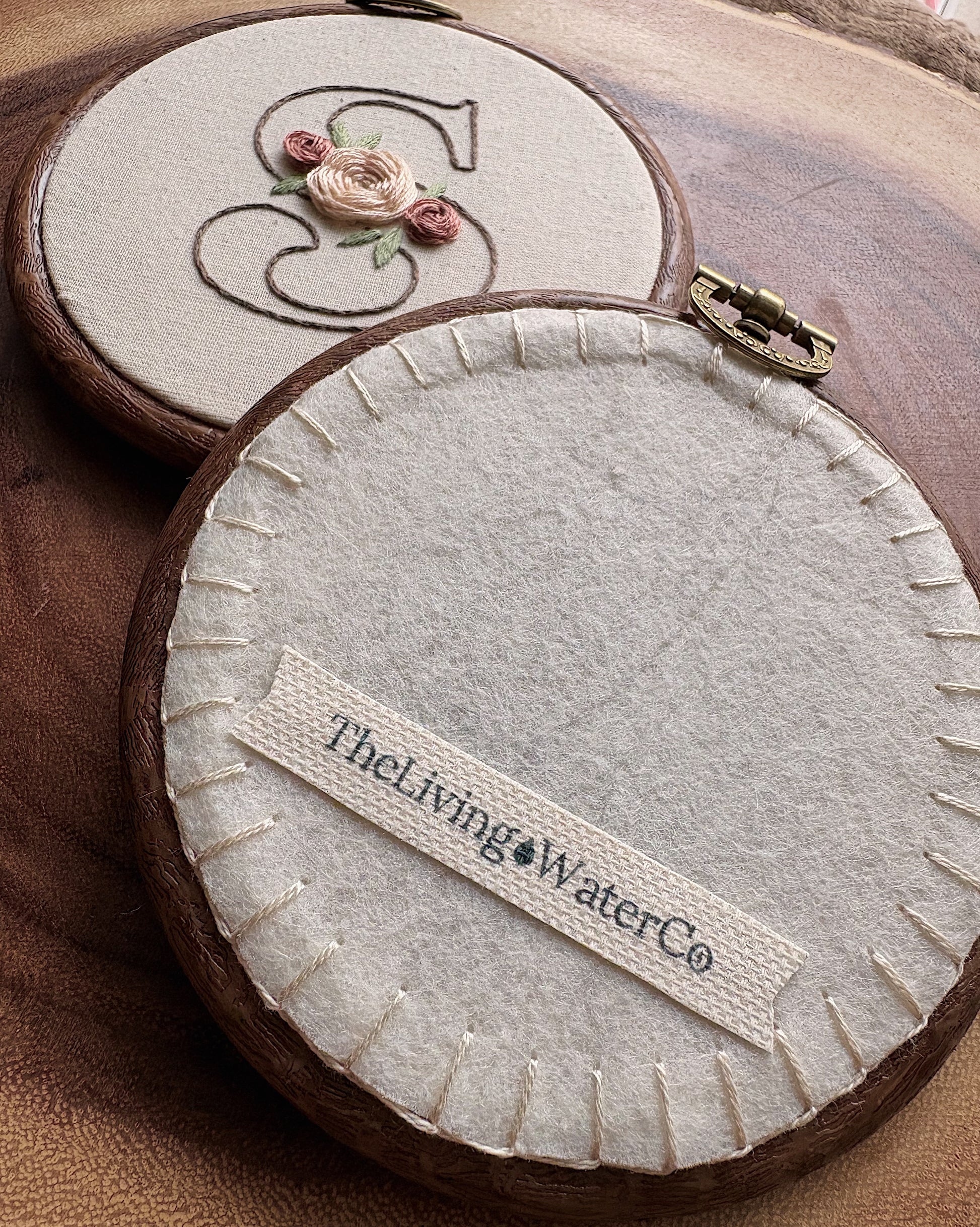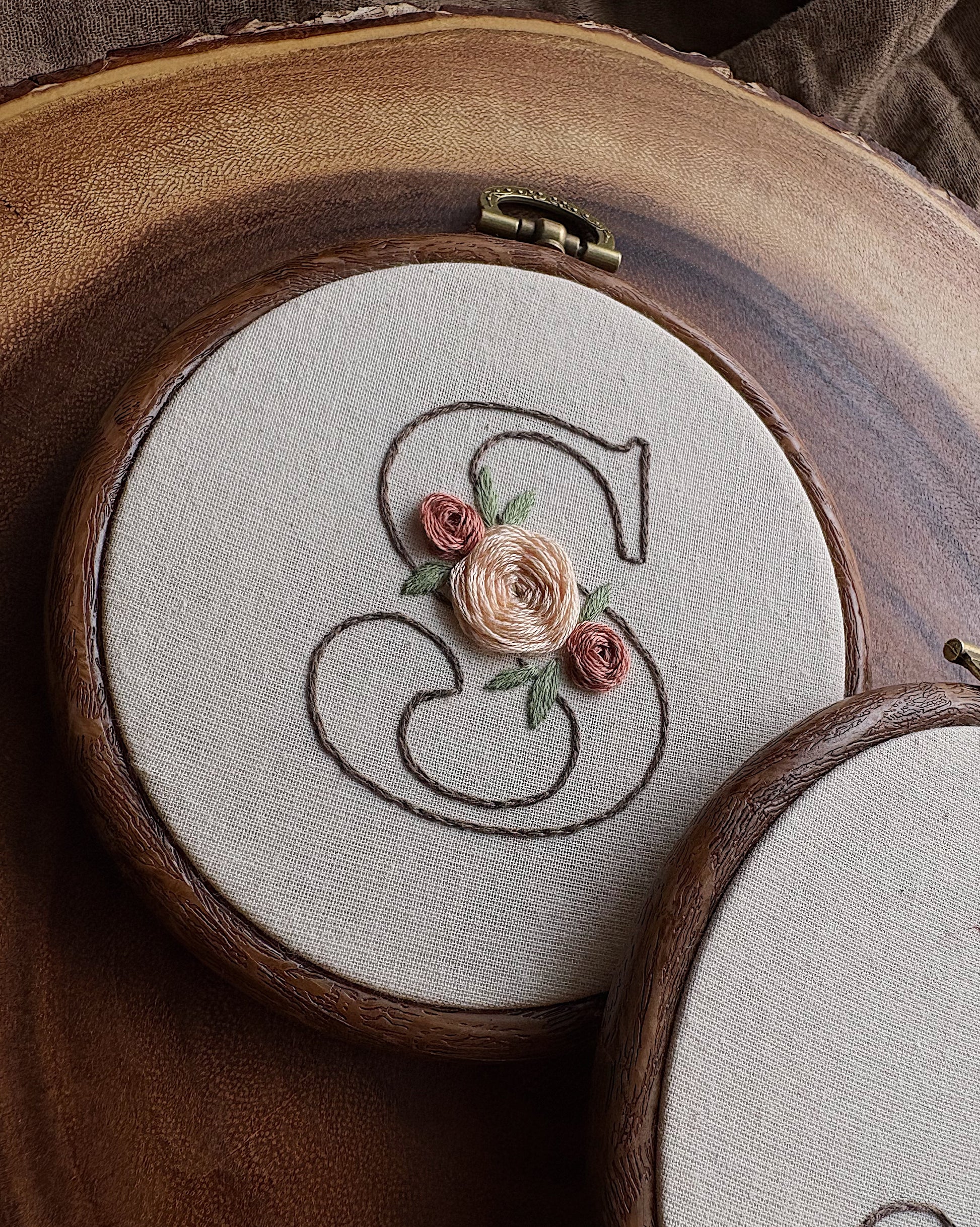 Choose your letter and it will be hand embroidered with a delicate rose bouquet nestled within the initial — stitched in soft pink and cream on cotton muslin, framed in a 4" faux wood hoop, and finished with an ivory felt backing.